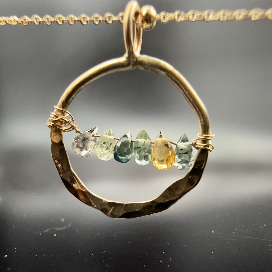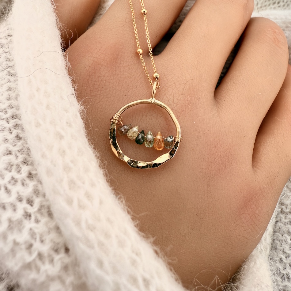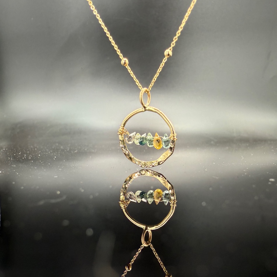 Le pendentif Aube, fabriqué à main en or jaune 18K martelé avec des saphirs de couleur, naturels, enfilés en pampilles.