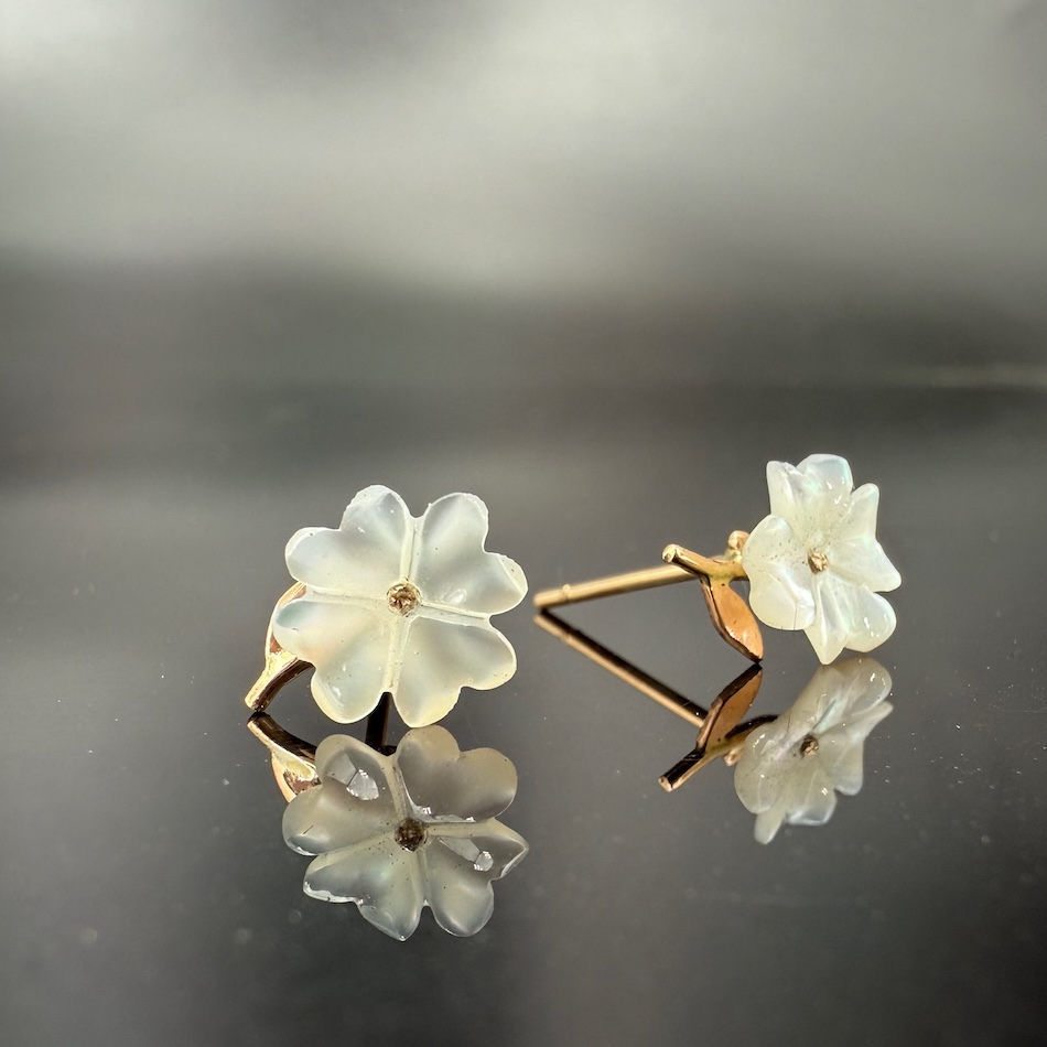 J’ai fabriqué les boucles Fiore à la main, en or rose et or jaune 18K. Les fleurs de nacre délicates, ont été taillées dans une Pintada Maxima. Pièce unique.
