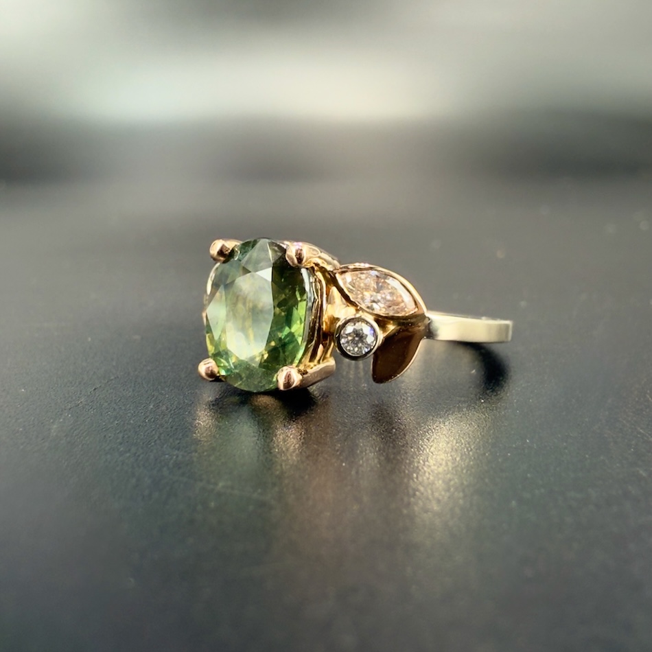 Un Saphir Vert de 3,10 carats, deux Diamants taille marquise et deux Diamants taille brillant.