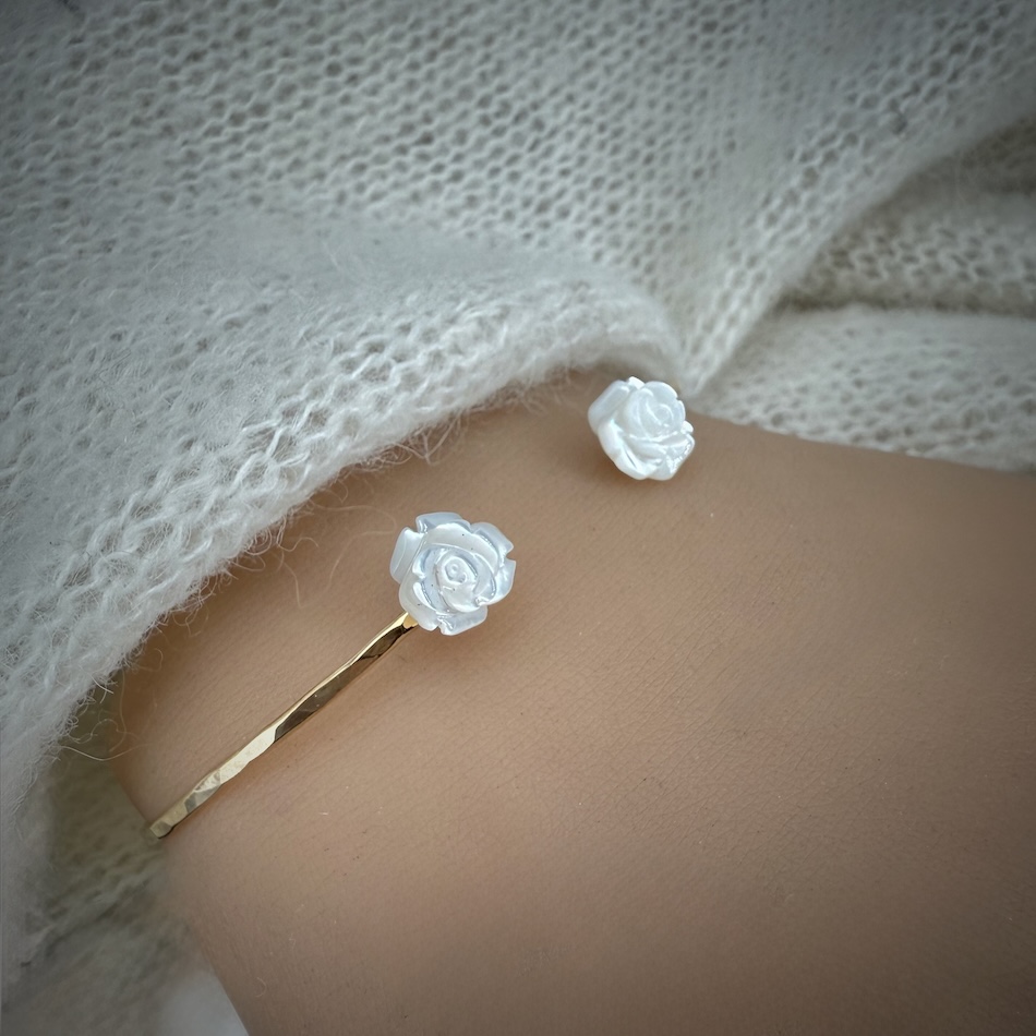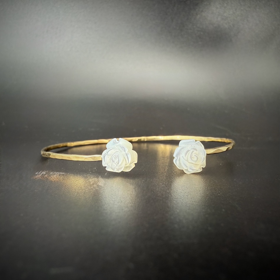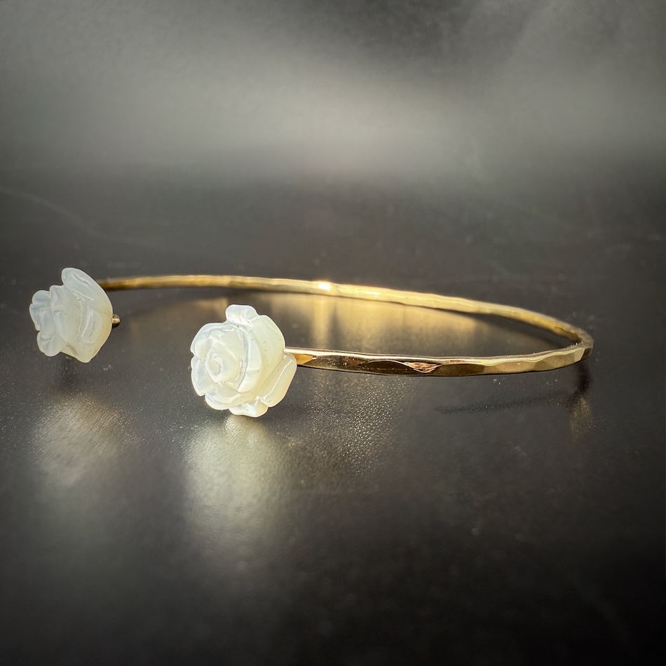 Bracelet en or jaune 18K martelé, perles de nacre sculptées.